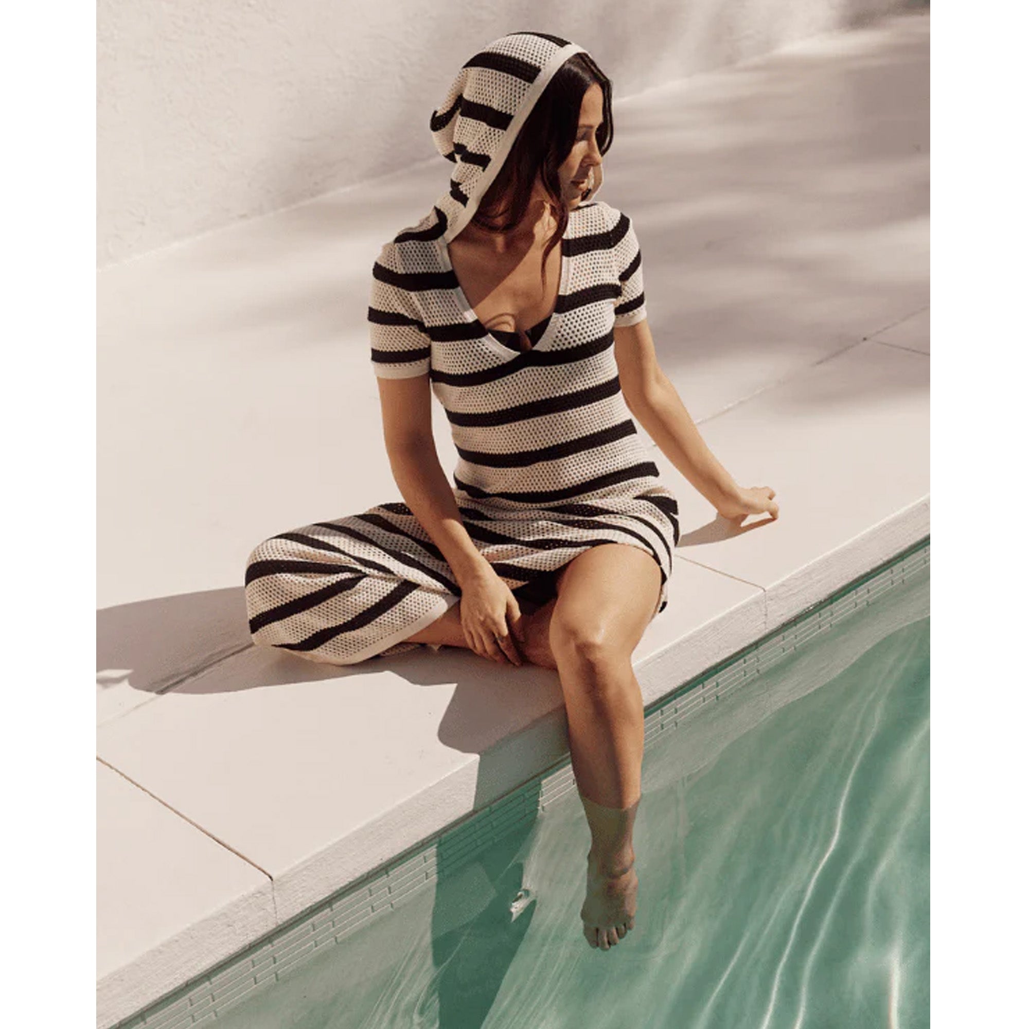 A cool girl full-length striped dress with an oversized hood. This short-sleeve, v-neck cotton dress is made from open-end knit netting with stretch and is perfect for lounging by the beach or shopping around town.