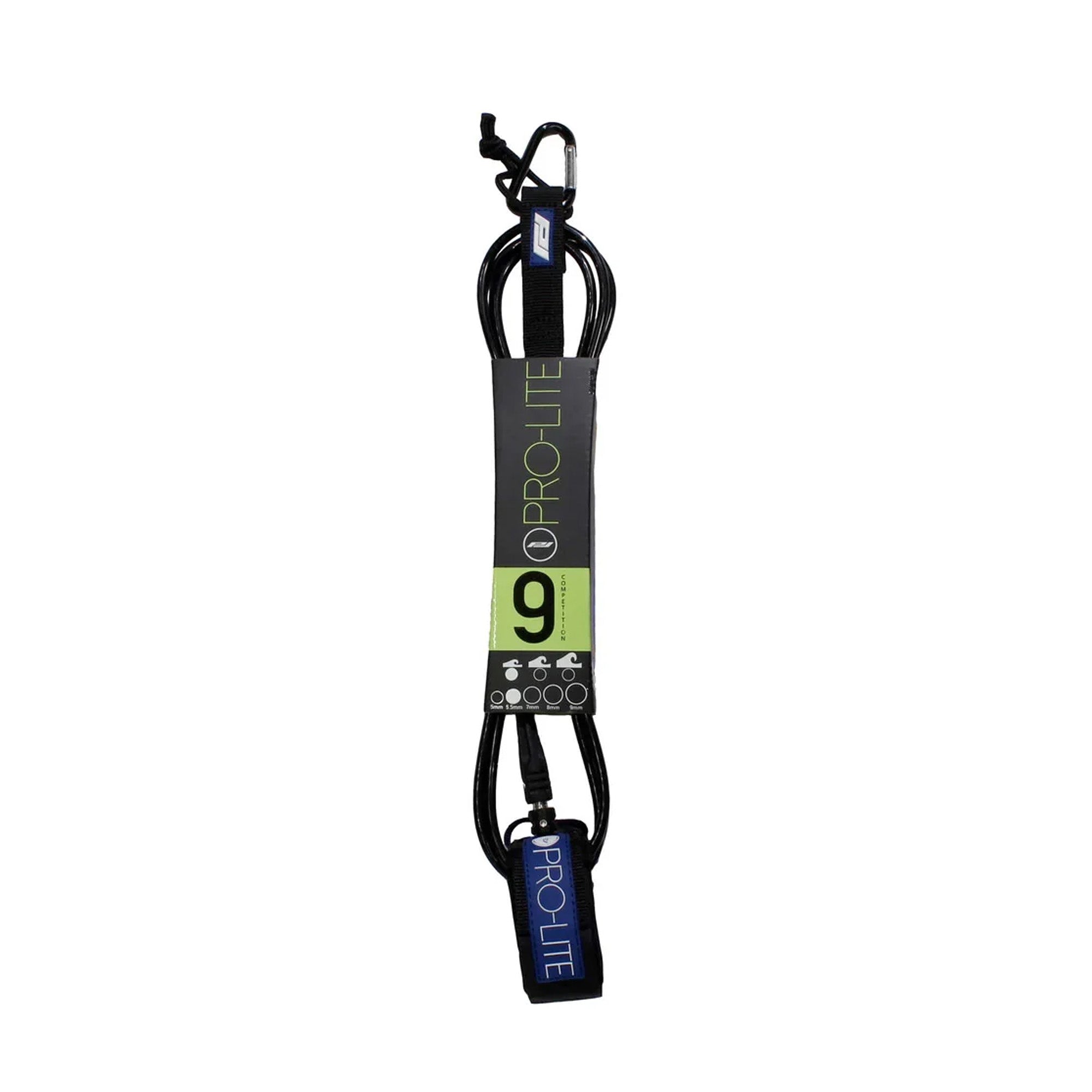 The Pro-Lite 9' Comp Surfboard Leash. The 9'0 Comp surfboard leashes are designed for small to medium wave surf. With a 5.5mm cord thickness, this leash is both light and tough. A good option for those average days. Features include double stainless swivels to keep the leash spinning smoothly and a recessed horn to reduce the pull on your ankle. Worried about somebody watching you hide your key in the rocks? Stash it in the hidden ankle cuff key pocket.