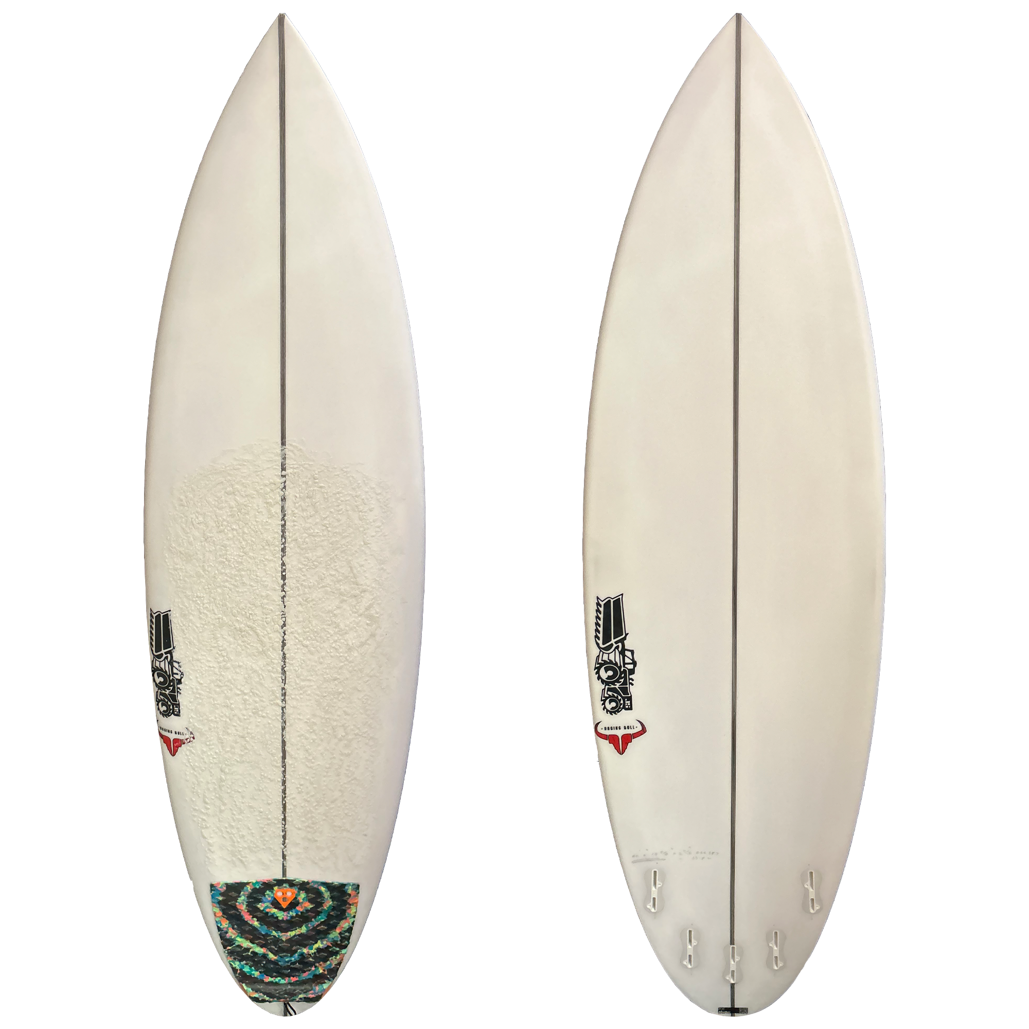 The JS Industries Raging Bull 6' Consignment Surfboard - FCS II is in decent condition with a few pressure dings along the deck and a few pressure dings along the bottom. There are a few scratches and stress fractures in the glassing too, but this board looks like it has only been ridden a handful of times if that. Theres also a ding repair in the tail area of the board but it looks like it could be repaired again.